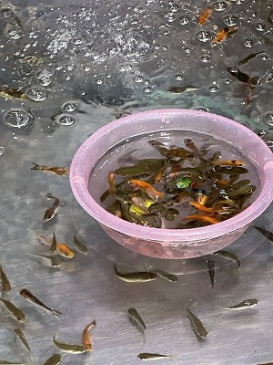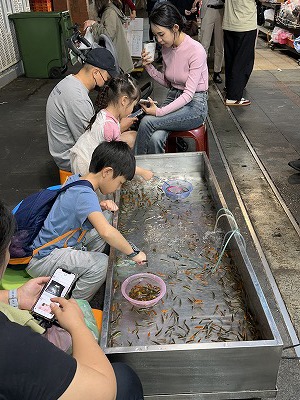 | 2026/04/01 金魚すくい名人? 士林夜市で、まだ暗くなる前に散策していると、金魚すくいで信じられない数の金魚をすくい取っている少年がおりました。 すくいあげた金魚が桶の中に何十匹も入れられており、なおもすくい取る勢いです。 これほど多くの金魚をとっている人は、今まで見たことがありません。 すごいなーと様子を観察していると、どのようにすくっても、紙が破れません。 よくよく見ると、破れない紙もしくはプラスチックシートを使った「ポイ」(金魚をすくう道具)を使って、楽しんでいる様子です。 金魚すくいは何回かすると紙が水にぬれて破れ終了する。--という従来のイメージとは異なる楽しみ方のようです。 最近はAIの進化などが騒がれておりますが、古典的な縁日の遊び方の違いで驚かされるとは思いませんでした。 |