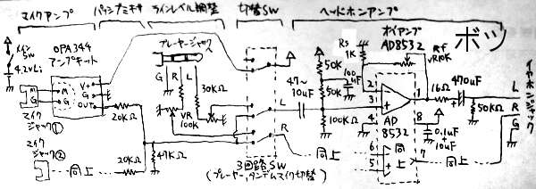 最初、下の図の形でマイクアンプを付けたが増幅されすぎて音割れしてしまった。