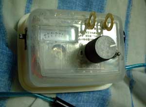 完成。ボリュームの上に見える二つの金色の輪は、出力端子。わに口クリップで挟んで使います。