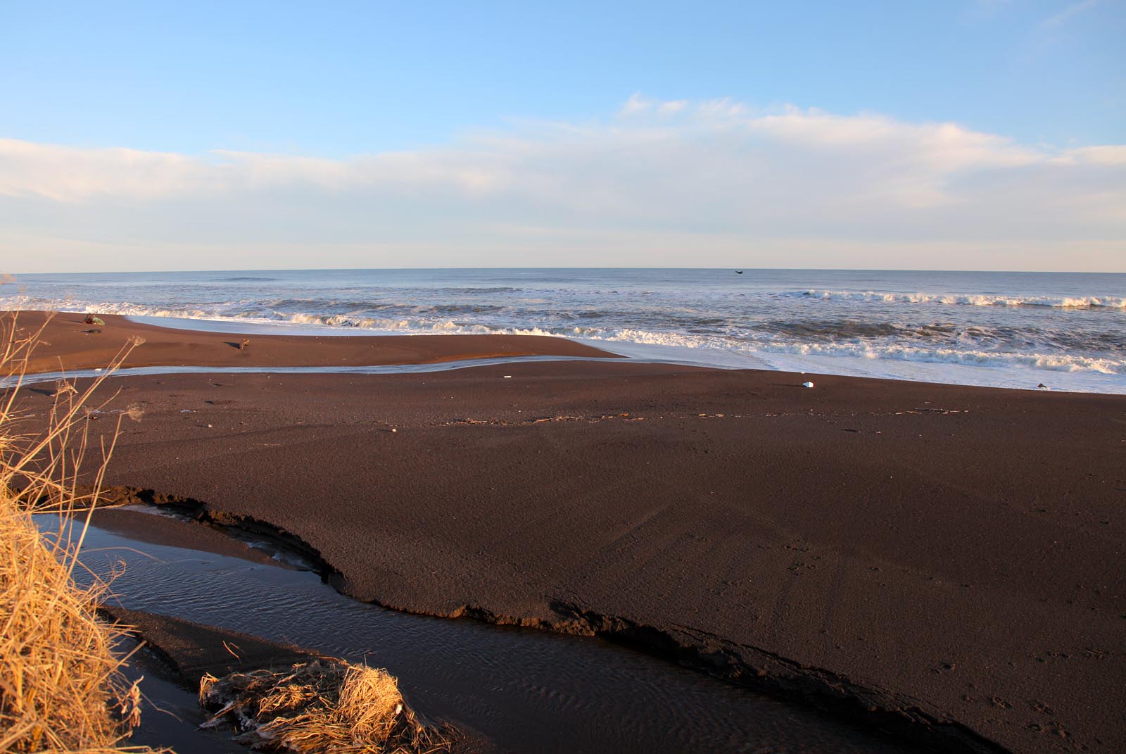 荒野をぬけて海に出た。尺別海岸というらしい。 砂は黒くて沖縄の浜とはぜんぜん違う。 | ||