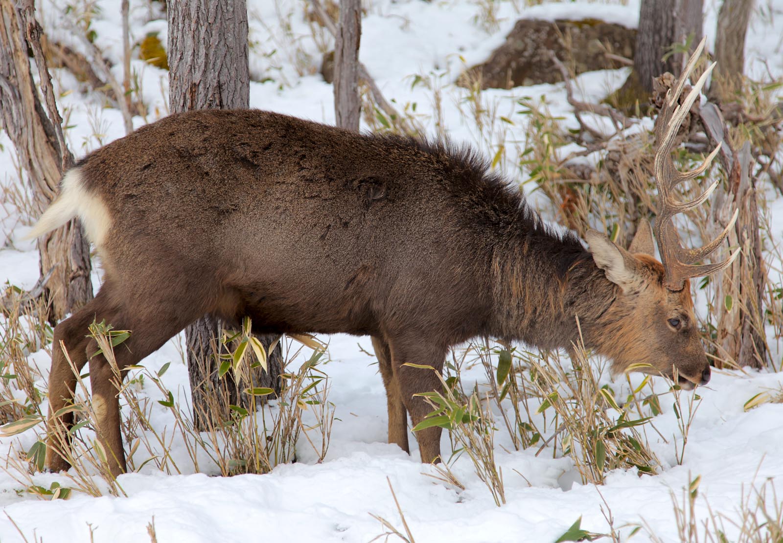 森の中をぬけて開けた場所に出た。 雪山をバックにエゾシカの群れ。絵になる。 | |