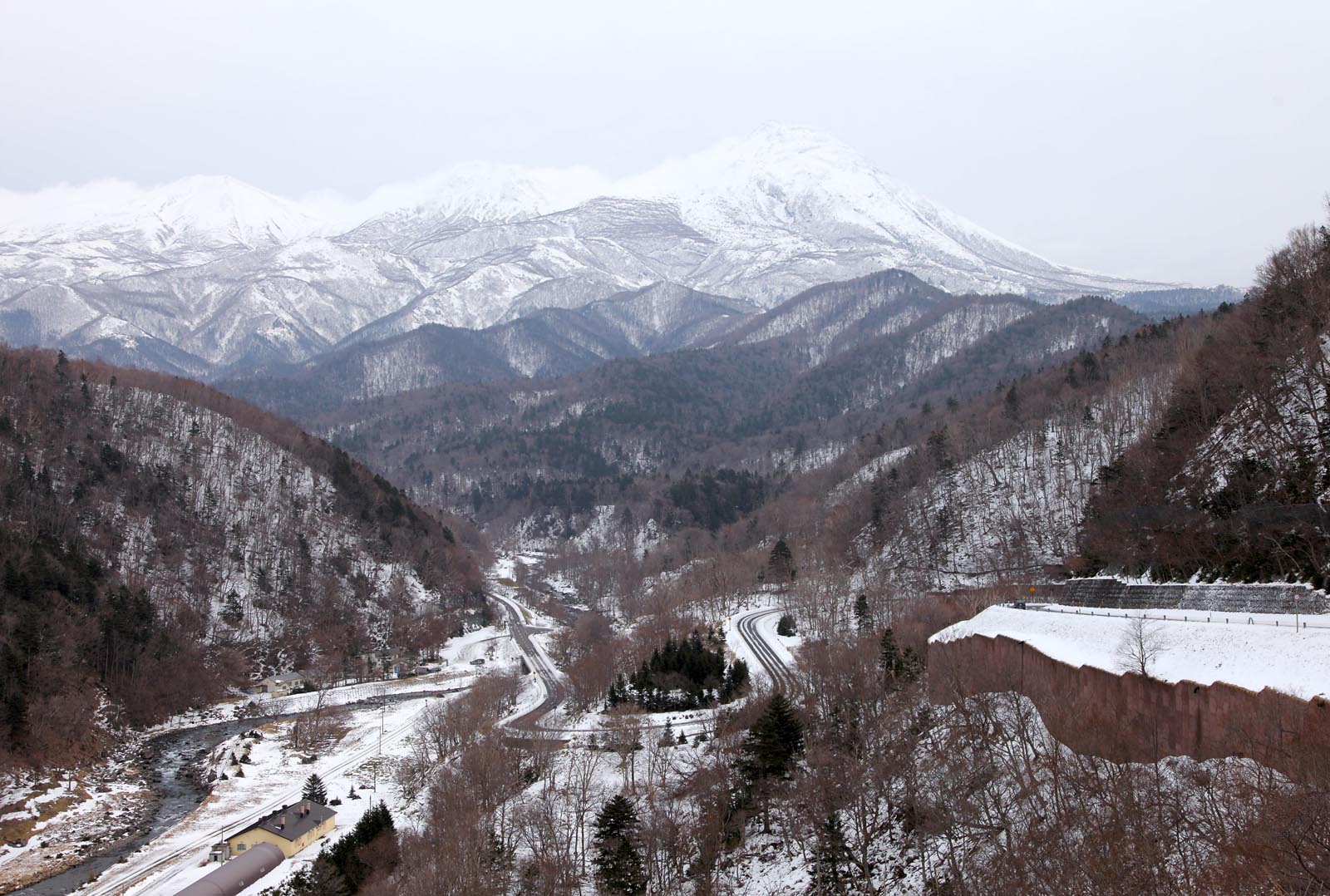 ![]() 岩尾別全景。 写真左下のイワウベツ川から先は冬季通行止めだったので、 車を降りて歩いて川べりを散策。 |