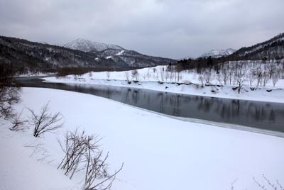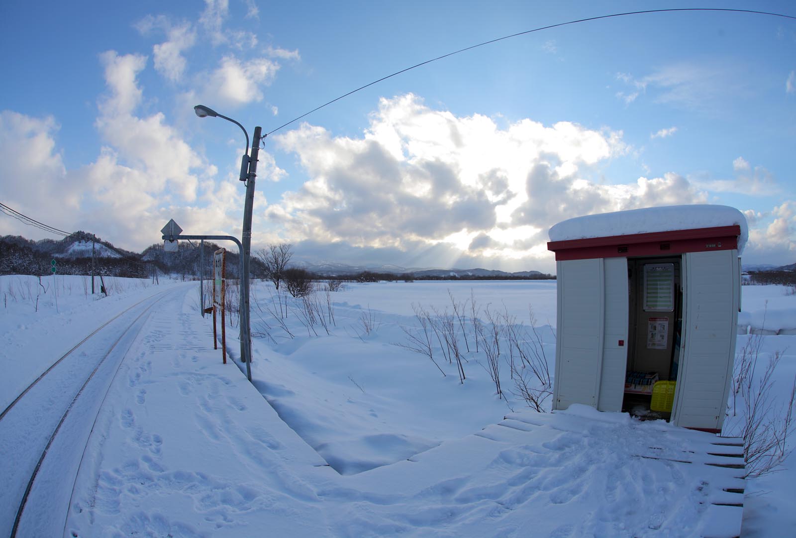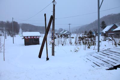 駅周辺に民家は無い。しばらく歩いて国道に出ると一軒だけ小さな商店があるが 閉まってたので、雪をかきわけ自販機まで行って暖かい飲み物を買った。 | |
