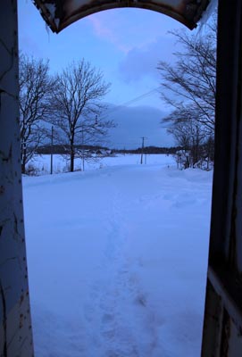 北比布で下車。宗谷本線の名寄以南はおおむね国道40号線に沿って走るが、 ここ北比布のあたりで国道は大きく迂回し、駅周辺は田園地帯が広がりとても静か。 しばらく利用客がいなかったようで、待合室と道路の間に雪が深く積もってたので掻き分けて入った。(足跡は俺の) | ||
