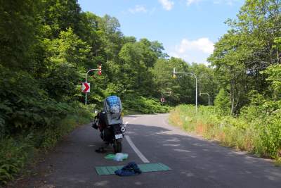 線形改良された旧道(両側にゲートがあるので車は入れない)にマットしいて昼寝。 さっきカメラを壊してから撮影の義務から解放されて、純粋に走りを楽しめるようになり、より気持ちよく走れた。 災い転じて福となす。カメラを失ってよかったかも。 でも、やっぱり動画撮りたい。 家にはもう一台ザクティ改造Cマウントカメラがあるので、親に電話して送ってもらうことにした。 |