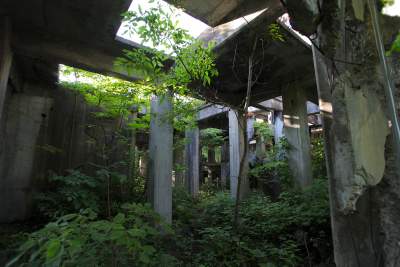 4階建ての大きな炭鉱住宅跡が泥道の両側に4棟、木に覆われてたたずむ。 かつてこの炭鉱は年間50万トンの石炭を産出、昭和40年には人口6000人を超える街だった。 それがいまやあたり一帯は完全な無人地帯、廃墟のみが残る・・・たまんねえな! | |