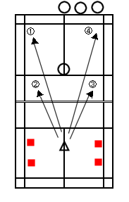 @4個所1本を5〜10本で1セット、3〜5セット実施。 Aフィードはロブ、ネット、ネット、ロブを出す。 Bスマッシュ、プッシュ(フォア)、プッシュ(バック)、後退し て、身体を入れ替えてスマッシュ(フォア)を打つ。 Cフィーダーはリズムよくフィードする。 D練習者は、フットワークを止めないようリズムにのって 打つ。