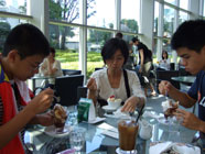 帰途ー羽田空港この旅行はモグラになったかのように地下鉄での移動が多かったので、モノレールで東京の街を上から眺めるのは気持ちがいい。空港に着くも、かなりの待ち時間があるので、夕食を「焼き肉が食べたい!!」という息子たちのリクエストに応えて、トラジというお店に入り、ゆっくりとおいしくいただき、帰りの航空機に乗り、広島空港へと帰路についた。 思いつき半分の東京旅行だったが、家族の評判もよく、「楽しかったねぇ。東京、いつでも行けるよ!」って感じを持つこともできたようなので、足を引きずりながら歩いた甲斐もあろうものである。今度は別の場所もうろうろしたいね。(あらてめて写真を見ると二男と私の肩にはいつもタオルがかかってる。暑いから見てくれなんて構っていられなかったんだよ。) |