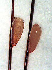1日当たり約5個の卵を頭髪の根元に近い所に固着産卵する。