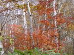 白樺苑路 はこのペンション村の行き止まりから始まる全長約2kmのハイキングコースである.はじめは少し急な下り坂が続く.ところどころに沢が流れており,木橋がかけられている.橋の上は滑りやすいので足元に注意して歩く.熊よけのパイプの鐘が数ケ所に置かれていた.最近,熊の出没が全国的にニュースになっているので,用心に越した事はない,ここは鐘を叩いて通り過ぎる.10分程で内回りと外回りの分岐点に出る.どちらへ行っても白樺池に出る事ができる.今の季節,道には落葉の絨毯が続き,顔をあげると,辺りはシラカバ林がどこまでも続く,そして色付いたシラカバの葉の間からの木漏れ日…どれもが美しく優しく,そして神秘的である.まるで東山魁夷画伯の絵のような….