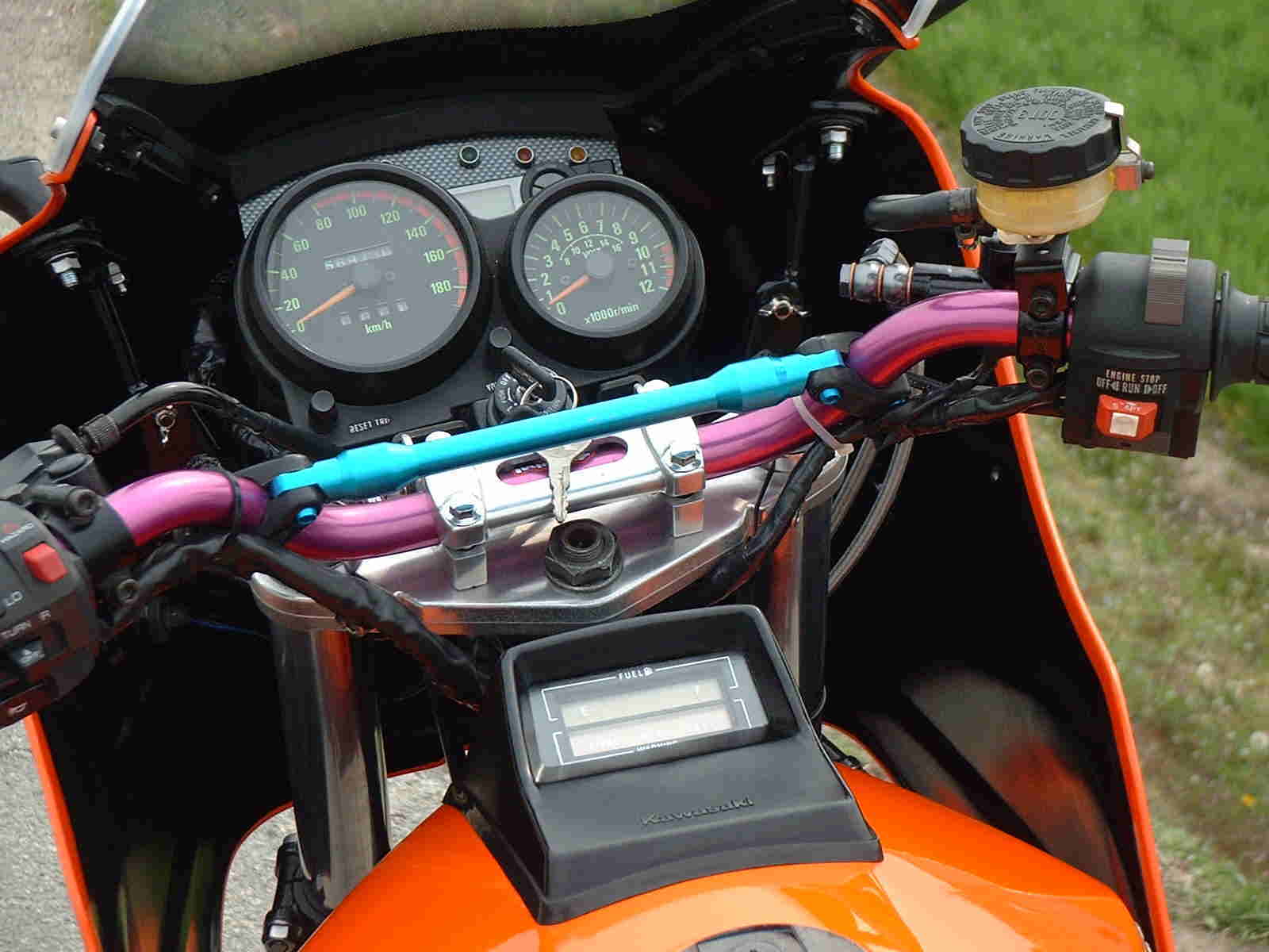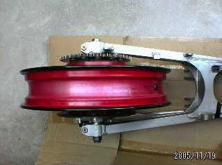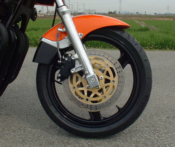 前後足回りをGPZ900R(ZX900A7)の流用しました。 フロントはアンダーブラケット・トップブリッジ・ブレーキ・ホイール・フロントフェンダーと全移植になりました。 アンダーブラケットはGPZ900Rを使い、トップブリッジはゼファー750の物を使いステムシャフトの径を合わす為カラー作成圧入しボルトオンで取り付けれるようにしました。これに合わせてフロントフォークもO/Hしました。 リヤはスイングアームはGPz750の物を使う為、ホイールセンターを出す為左右カラーを作成しチェーンラインの合わせました。 リヤブレーキはGPZ900R用のブラケットを加工し、キャリパーを下側にフローティングする為ロッドをフレーム側から取っています。 トップブリッジにハンドルブラケットを取り付けハンドルは社外品を使いバーハンにしまし,スイッチ関係も現行車輌の物で、フロントブレーキはホンダ純正のマスターシリンダーで別体式に変更しました。 リヤサスは基本的にO/Hが出来ませんので、オイル漏れを確認したところ特に無いようでしたのでエアー注入口からオイルを抜き、新しいオイルを入れエアー抜き後ホースを取り付けてOKです。 これによりオイル劣化からのふわふわした感じからしっかりした物に復活しました。 |