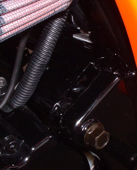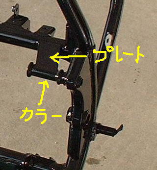 排気量の大きな旧車によく有るのですが、ドライブスプロケット側のカラー部分に歪み(曲がり)が出ます。この車輌も出てましたので、プレートを入れカラーをフレームに溶接する事で補強しました。それ以外は特に曲がりなどは無く、オーナーの好みも有り他には補強を入れませんでした。 |