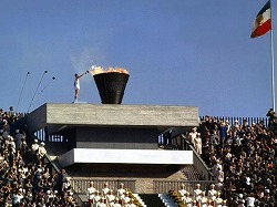 さて、それから4年後、テレビ放送で観た東京五輪の開会式(もちろんモノクロ)はこんなだった。聖火の最終ランナーが陸上競技場にさっそうと入場。皆が固唾を呑んで見守る中、トラックをまわり、聖火台までの長い階段を駆け上がり、高く掲げたトーチの聖火を聖火台に点火。これぞまさに感激の一瞬。