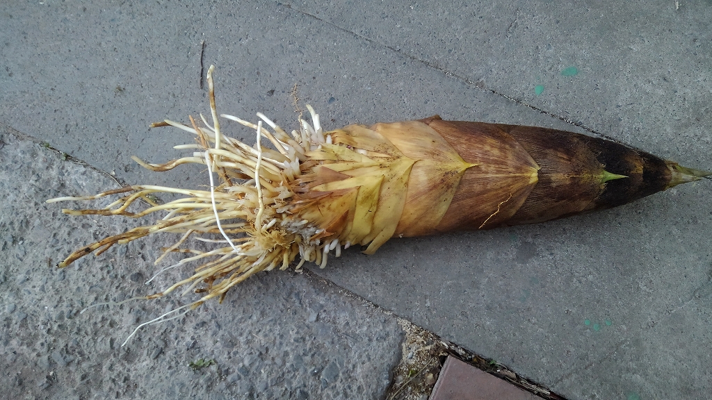 今年は暖冬だったこともあってか、竹の子の数が多い感。最近の日課として、愛犬きくの散歩のたびにその辺りを物色し、棒など立てたりして目印にしておくか、臨機に応じて掘り起こす(最近では現場にスコップ常備)。これがけっこうの重労働で、どうしてかというと、孟宗竹の竹の子は地中に深く、地上に頭を出して伸びるころにはエグ味(アク?)が出るため、数センチでも頭を出したら掘り起こす作業となる。