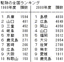 中山間地の農業でのいちばん大きな悩みといえば、獣による農作物の被害だろう。今から30年前と比べると、自然環境は改善の兆しも少ないけれども、悪化の一途というわけでもない。 にもかかわらず、統計によればここ最近イノシシひとつをとっても、捕獲される数は確実にふえているそうだ。九州での捕獲数はとくに多く、またその全体の数もうなぎのぼりで、1980年を境に急激に増加している。1960年、全国ランキングで上位の山口県が481頭、広島207頭だったのが、2000年にはなんと、山口3823頭、広島4649頭となっている。2000年の野生生物による農業被害額は133億円ともいわれていて、の中山間地での獣害が増えてしまっているのはどうしてなのか。 こういったことへの原因について、いろいろなことが言われている。ゴルフ場などのための開発により、野生動物の生活圏が奪われた。松や広葉樹の伐採、杉ヒノキなどの常緑樹の増加で動物のえさが減ってしまった、など。しかしながら、それらの理由付けもあまり当てにはならないような気もする。その大きな理由としては、イノシシの数が約40年前とは比べものにならないほど増えてしまっているからだ。 現実にここ音羽町でも、このところイノシシ、シカ、サルなどによる、農作物の被害がひんぱんに起こっている。 とくにイノシシによる被害は甚大で、畑にとって致命的ともいえるほど。根ものの野菜は根こそぎ掘り起こして食べてしまうし、稲なぞは、せっかく育ったところを一面むちゃくちゃに荒らしてしまうという始末。この場合、食い荒らすというよりは、走り回るという感じ。 これではたまらないというわけで、山と里の間あたりに獣の捕獲用の檻を仕掛けることとなる。このような仕掛けは、意外と見通しがよく、開けた場所におくと効果があると見え、音羽町の3つのうちのひとつの地区では、昨年なぞはひとつの檻で一夏20数頭も捕獲されている。 近年の獣害の急激な増加について、いちばん有力な説として、とくに中山間地での離農があげられる。右の表では少しわかりにくいですが、1980年以前まではなだらかに食糧自給率は低下していますが、80年代からの低下が若干急激となっています。現在、離農のはげしい中山間地では山を背後にした農家の空き家や、雑草の生い茂った休耕地が点在。イノシシにとっては絶好の住処ともなりうる。さらにその間近には作付けされている大根やにんじん、ジャガイモ、スイカなど。彼らにとっては、住宅と食糧倉庫のふたつがあてがわれたようなもので、快適そのものの生活ということになる。