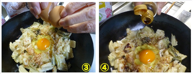 フライパンにごま油をしき、刻んだ白菜を強火で炒め、軽く焦げ目がついたら玉子を落とす(玉子は混ぜ絡めてもよい)