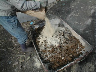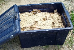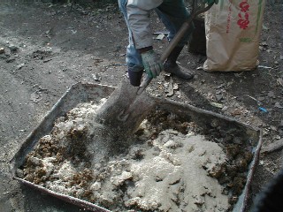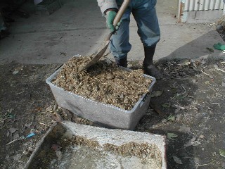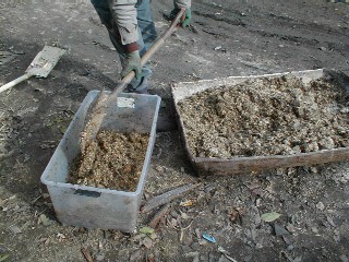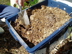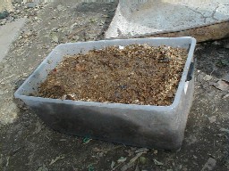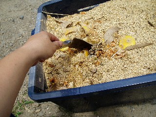 | くぼみに生ごみをかためて置き、床材をからめるようにする。さらに床材を軽くまぶしておく。 |
