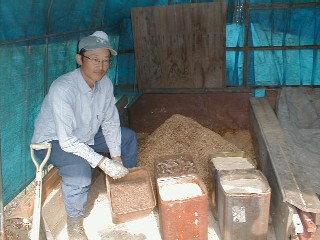 一度にたくさん作るときには、左の写真のように一斗缶を使うと便利。 |