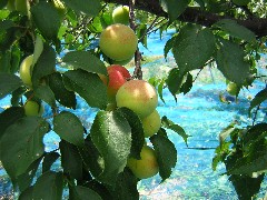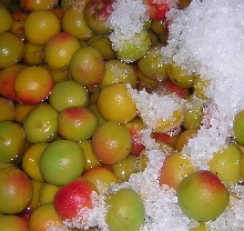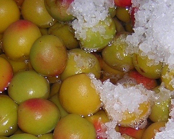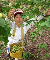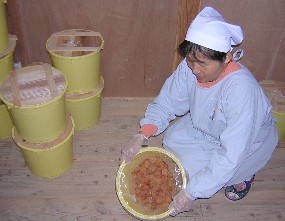 梅ぼしをつくるための梅は、まさに完熟したものだけを使います。梅の木の下にネットを張っておいて、熟して落ちてすぐのものを漬け込みます。だからその甘味を充分に含んだうまみたっぷりのおいしい梅ぼしができます。