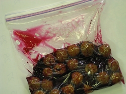 セット内容の白漬梅ともみしそをジップ袋にいっしょに入れ、空気を抜いて密封する。 もみしそをまんべんなく梅に混ぜ込むと色よく漬けあがります |