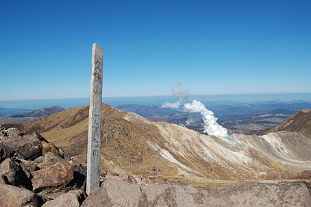 | 30分ほどで【中岳山頂(1790m)】に到着。 九重連山の最高峰です。 ここまでほんのちょっとの急登りなんですが、 高度感があるので高所恐怖症の私は既にヘッピリ腰。 でもここまできたら「ドーン」という音の基が見えた。 【硫黄山】というらしい。あそこから噴煙が上がっていたのねー。 山頂からちょっと下がったところでお昼にします。 お昼といっても飛行機でガスカートリッジを詰めなかったので、 温泉街で購入したアンパンと水のみ。 それでもこの眺めがごちそう。ここもまた、去りがたい風景。 幾重にも重なる山々を眺め、深田さんが「九重共和国」と言った意味がなんとなく解った気がした。 |