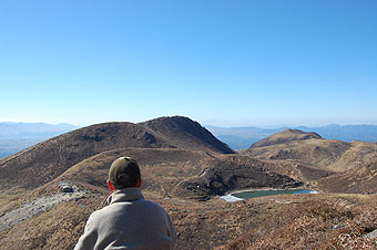 ![]() ・中岳山頂より。右が御池、左が避難小屋 |