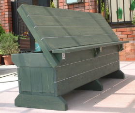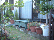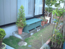 実は、単なるベンチは、一度製作済みでしたが、木が腐ってきたので急遽再製作に挑んだわけです。しかし、ふとひらめき設計変更してこのようなものに仕上がったわけですが、このたた〜プロジェクト発足は、かるい気持ちから、ベンチが出来あがったころに思いついたため、製作過程の写真、設計図等がないため、とっても簡単な説明となりました。次回?から、このページを意識した作りができればいいなあと思っています。