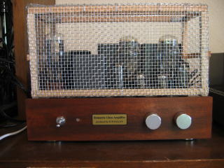 ボンネット代わりに台所用の棚台と針金の網でこんなガードを造ってみました。真空管がむき出しだと何かの拍子に物をぶつけそうでどうも気になってしまいます。色づけはラッカー・スプレーを使いましたが、使用中の臭いが強烈でまいりました。人様には自慢できませんが、自分用としてはまずまずです。