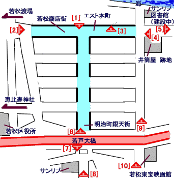 エスト本町を出て、若松駅方面の風景。 昔は、右手に「アトム模型店」がありました。 小学生の頃からずっと、この模型店でプラモを買っていました。 1997年12月25日で閉店になるまで、この模型店以外でプラモを買ったことは、なかったはずです。 |