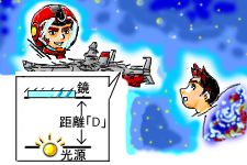 図2のようにヤマトの中に「1枚の鏡」「1つの光源」があるとしましょう。また、その「光源」と「鏡」の間の距離を「D」とします。 |