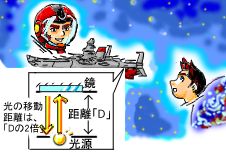 | しかし、逆にヤマトの速度が遅ければ、タイムマシン効果は大して発揮されません。図4で考えてみますと、ヤマトの移動速度が遅ければ、光の移動距離は「Dの2倍」とほとんど変わらないのです(光源から発せられた光が鏡に反射して戻ってくるまで、ヤマトの移動速度が遅いことから、光源がほとんど移動していないため)。