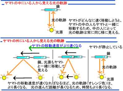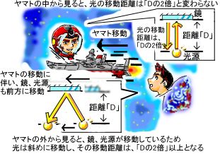 | 図4をまとめますと、ヤマトが移動している場合、以下にように、見る人の場所によって光の移動した距離が異なるのです。
