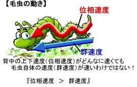 まずは左図の「毛虫の背中」に注目します。毛虫が移動する時に、この背中は上下に波打って動きます。それも毛虫の移動速度よりも速く波打って動きます。 逆を言うと、「毛虫の背中は、上下に速い速度で波運動をするが、毛虫自体は、その背中の【上下速度より遅い速度】で移動する」のであります。イメージできますか? つまり、どんなに速く背中を動かそうと、毛虫自体は、それほど速く移動していないのです。 これを今回の光に当てはめてみます。 毛虫の背中のように、上下に速い速度で波運動に当たるものが、イオン化された気体内を移動して光速を越えた光の速度。これを『位相速度』と言います。 毛虫自体の速度に当たるものが、情報を伝える速度なのです。これを『群速度』と言います。 タイムマシンを作る際の重要となる速度は、この場合でいうと、「光速を越える:位相速度」ではなく、「情報を伝える:群速度」なのです。この「群速度」が光速を越えないと、タイムマシンの実現には意味がないのです。伝達される情報が光速を越えないと過去を見る事が出来ない、または過去へは行けないのです。 |