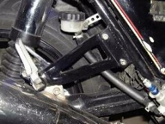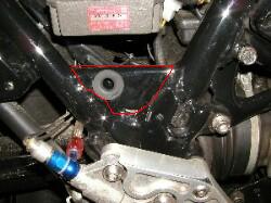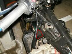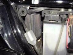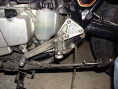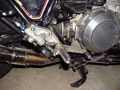 | 左側のバックステップラジエタ−のリザーバタンクが上手く付かず、ノーマルの止め金具があるのですが、切断して無理矢理取付け。 |