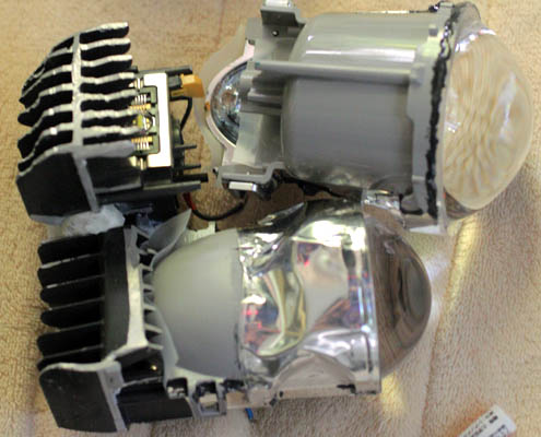 ヒートシンク背後のネジを外してプロジェクターを分離し、留め金具を外してLEDも取り外す。(シリコングリスで熱伝導させるようになっている)