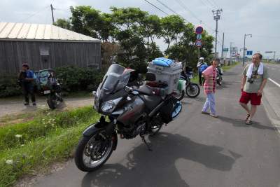 出発は宿のご主人夫婦が見送り。 箱に張ってあるカッティングシートを見ていろいろ聞かれた。 店のシャッターにある文字や絵もカッティングシートで作ったって。 この吉里吉里の宿&カフェに立ち寄ったすべてのライダーの写真をご主人が撮影してライダース名鑑を作ってるが、俺が泊まった直後の2011年晩夏ごろからデータ化していて、俺の分は店に行って冊子を開かないと見られず、残念だ。 |