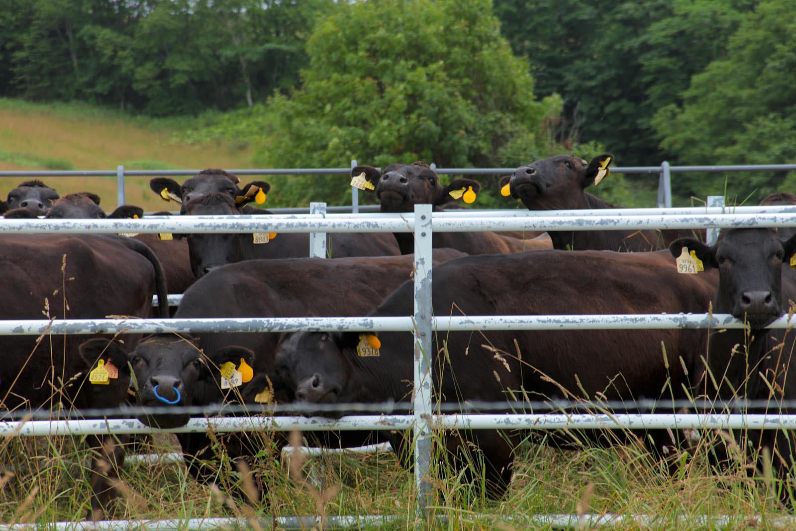 道沿いに牛がいたので降りたら、牛たち柵の隙間に顔を押し込んで必死にこっちを見てる。 何がそんな興味を引くんだ?好奇心旺盛なんだな。 | |